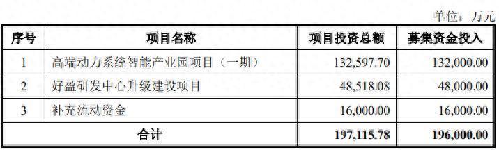 公司募集资金扣除发行费用后,拟用于高端动力系统智能产业园项目(一期)、好盈研发中心升级建设项目以及补充流动资金,具体如下: