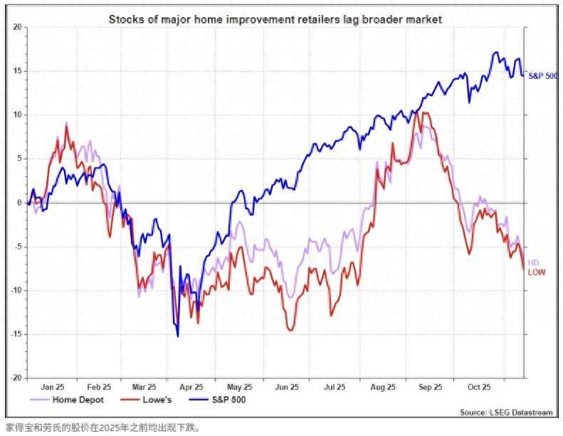 在过去12个月中,劳氏股价下跌约16%,家得宝跌幅超过11%,而同期标普500指数上涨了15%。